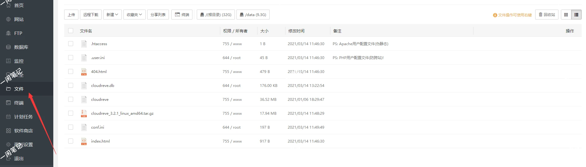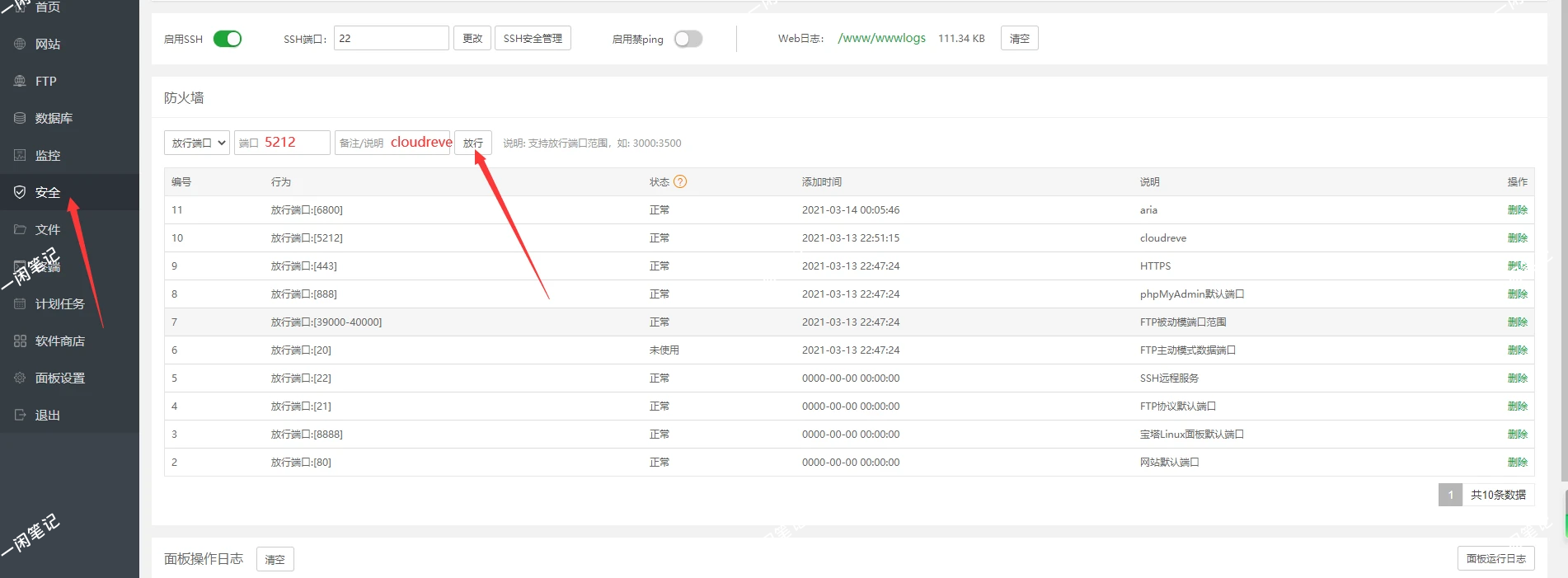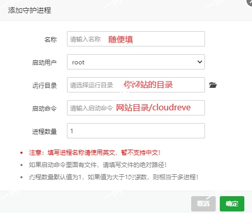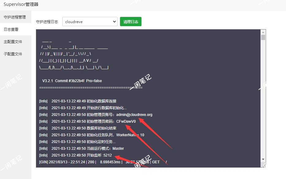 ⑤安装cloudreve:进官网下载http://cloudreve.org/,用宝塔面板上传到网站根目录并解压。进软件商店,安装Supervisor管理器 2.2。添加守护进程,如下图。启动进程,在日志查看里找到并记录cloudreve的管理员账号密码。在安全界面的防火墙里面,放行5212端口,并在自己的服务器端放行5212端口。测试你的服务器http://服务器IP:5212。