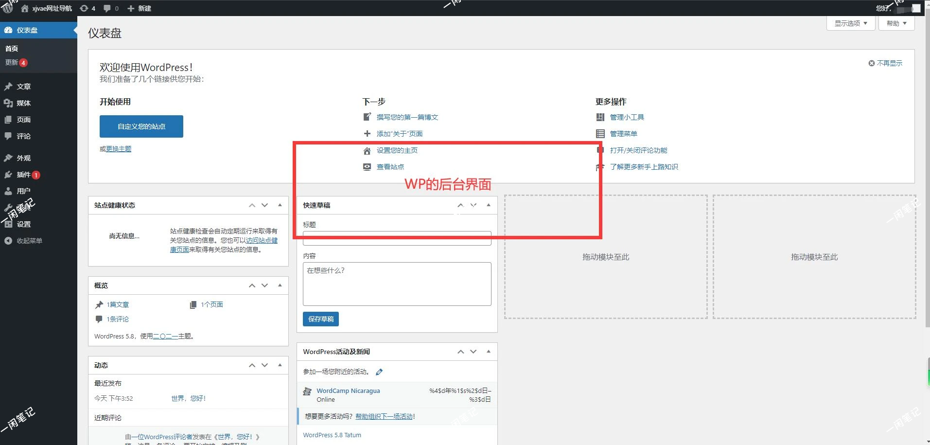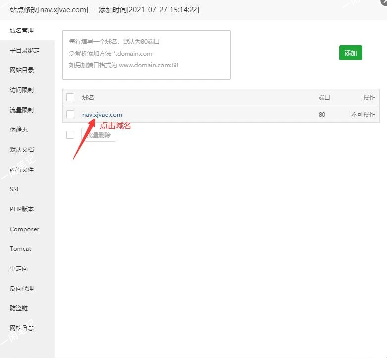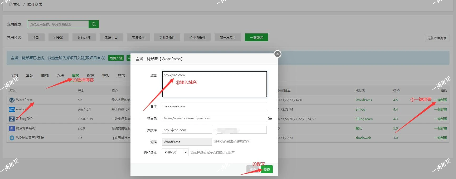 ①进入宝塔面板,在软件商店里选择博客→WordPress→一键部署。将域名输入,我的域名为nav.xjvae.com,然后提交,等待一键部署完毕。(注意数据库和密码,后面用得到。)