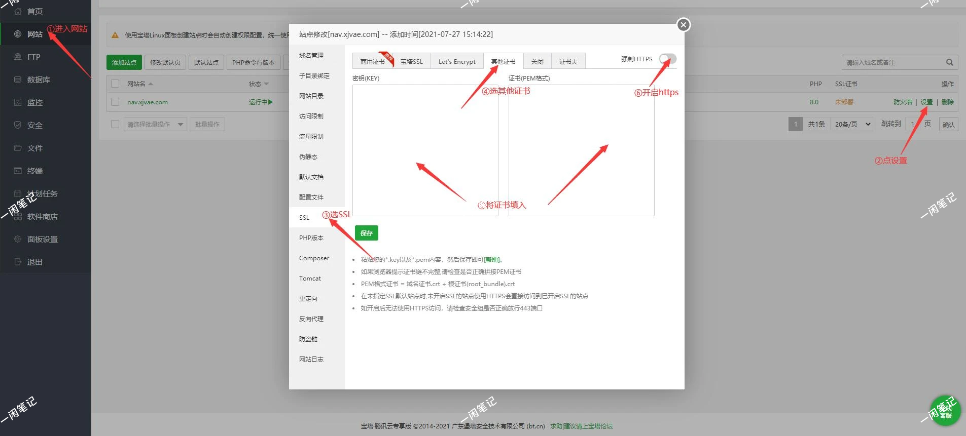 ②进入网站,点击右边的设置按钮,找到SSL,将你的证书填入其他证书里面,并强制开启https。