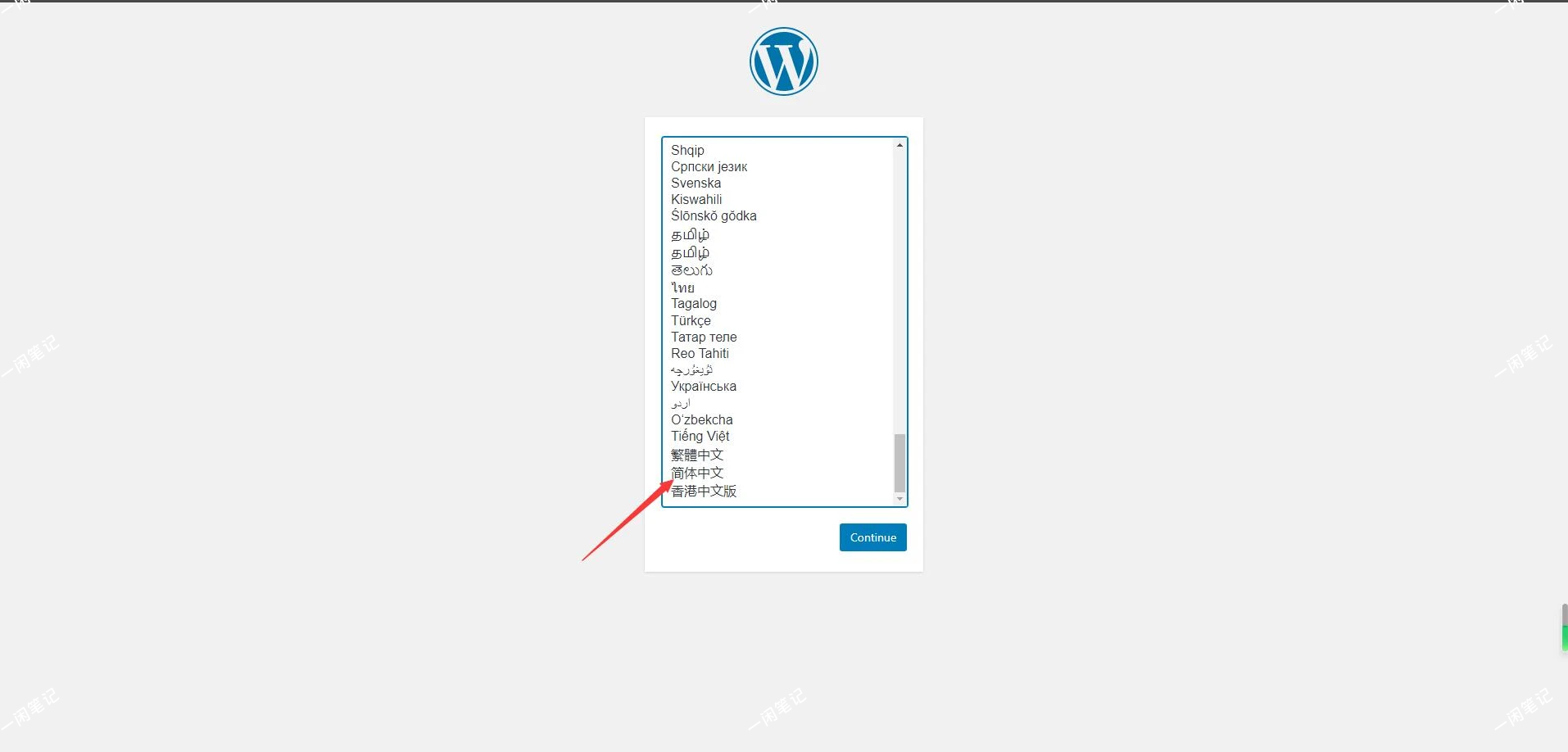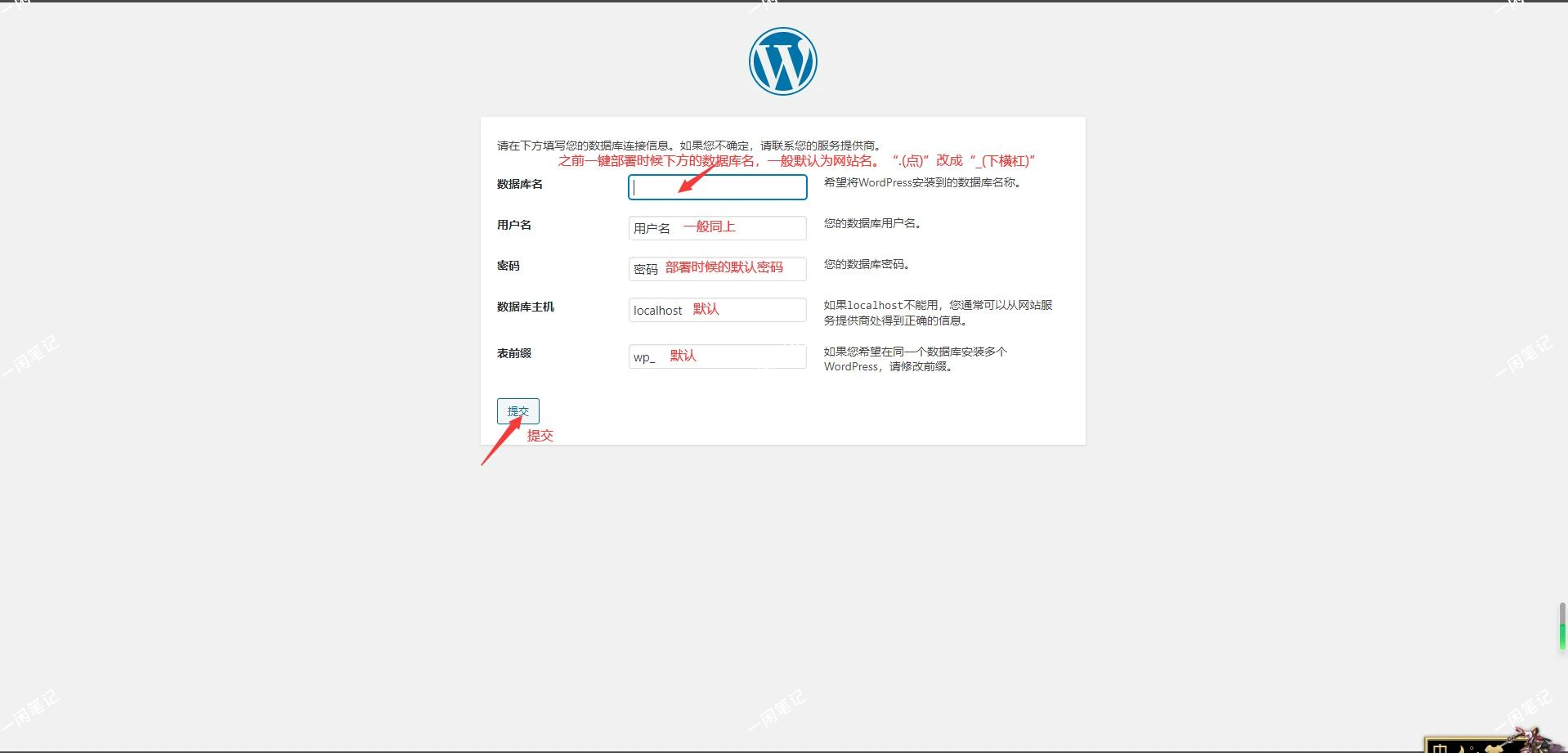 ④打开网站后,选择简体中文继续,填入之前一键部署时候下方的数据库名,一般默认为网站名。“.(点)”改成“_(下横杠)”,用户名和数据库名相同。密码为部署时候的默认密码(后期也可更改)。数据库主机和表前缀为默认,提交即可。
