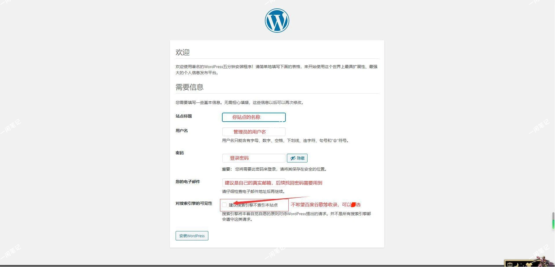 ⑥填写网站相关信息。站点标题为你站点的名称,用户名为管理员的用户名和登录名,设置好登录密码,邮箱**为自己的真实邮箱地址,后续可以找回密码,也可以用邮箱登录后台。对搜索引擎的可见性,如果不希望被百度谷歌等收录,可以勾选,一般默认即可。完成安装。