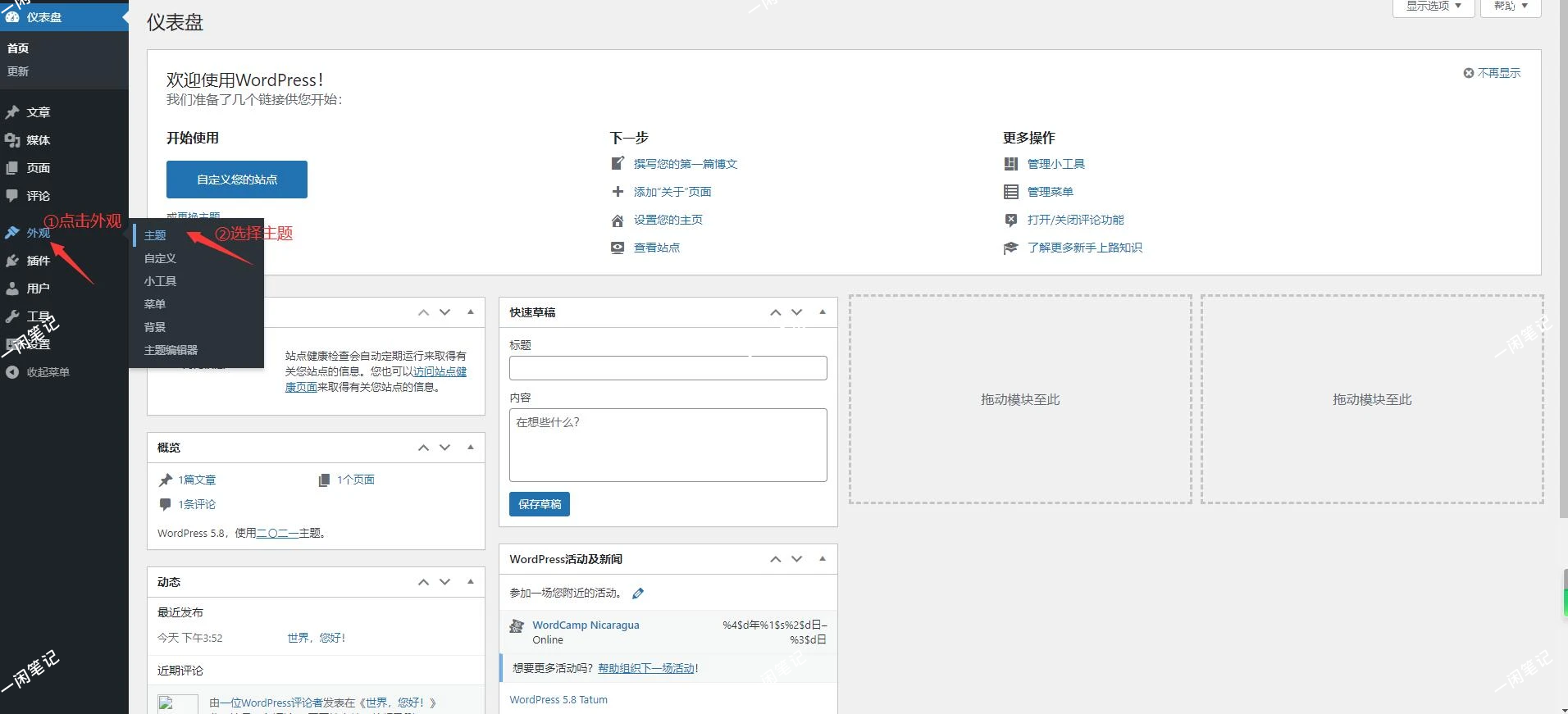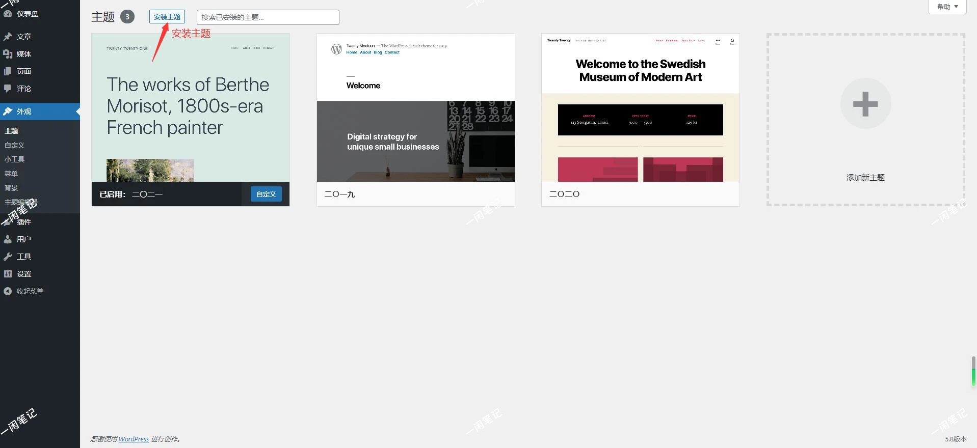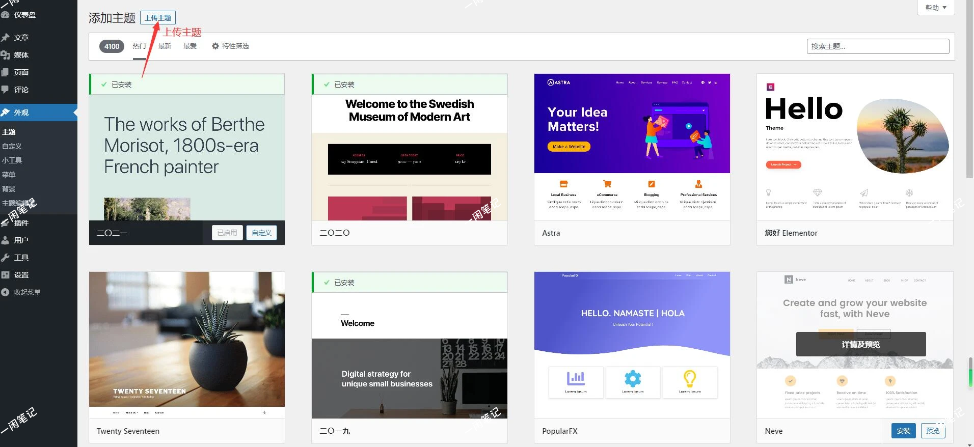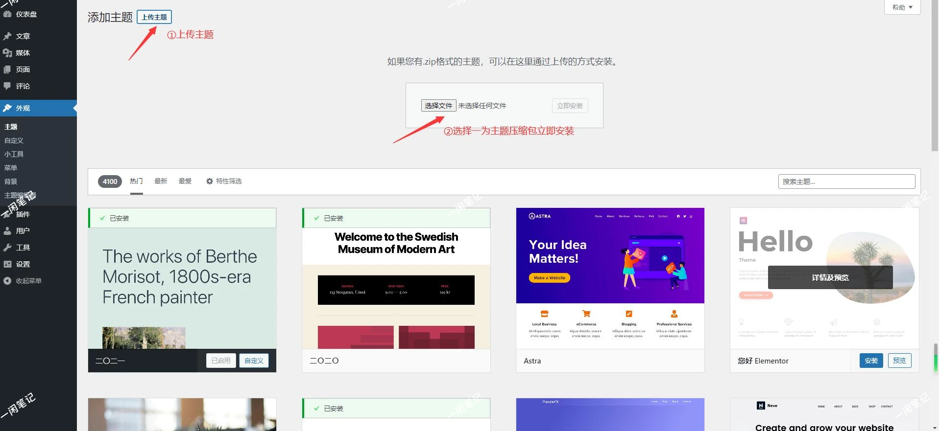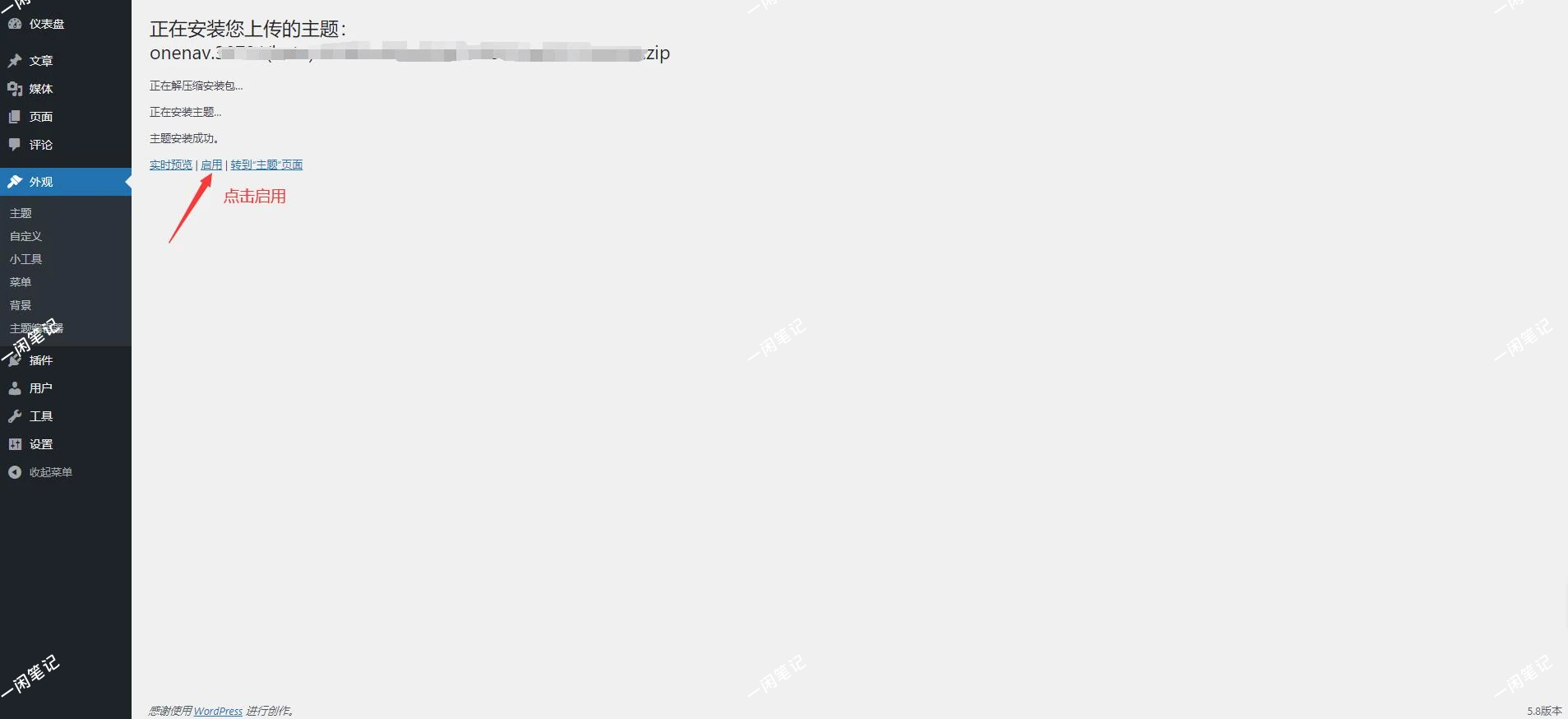 ⑦登录后台后,找到外观,选择主题,点击安装主题,找到上传主题,选择文件(必须为zip格式),等待安装完成,并启用。(主题请前往一为主题,找到你的订单下载。)
