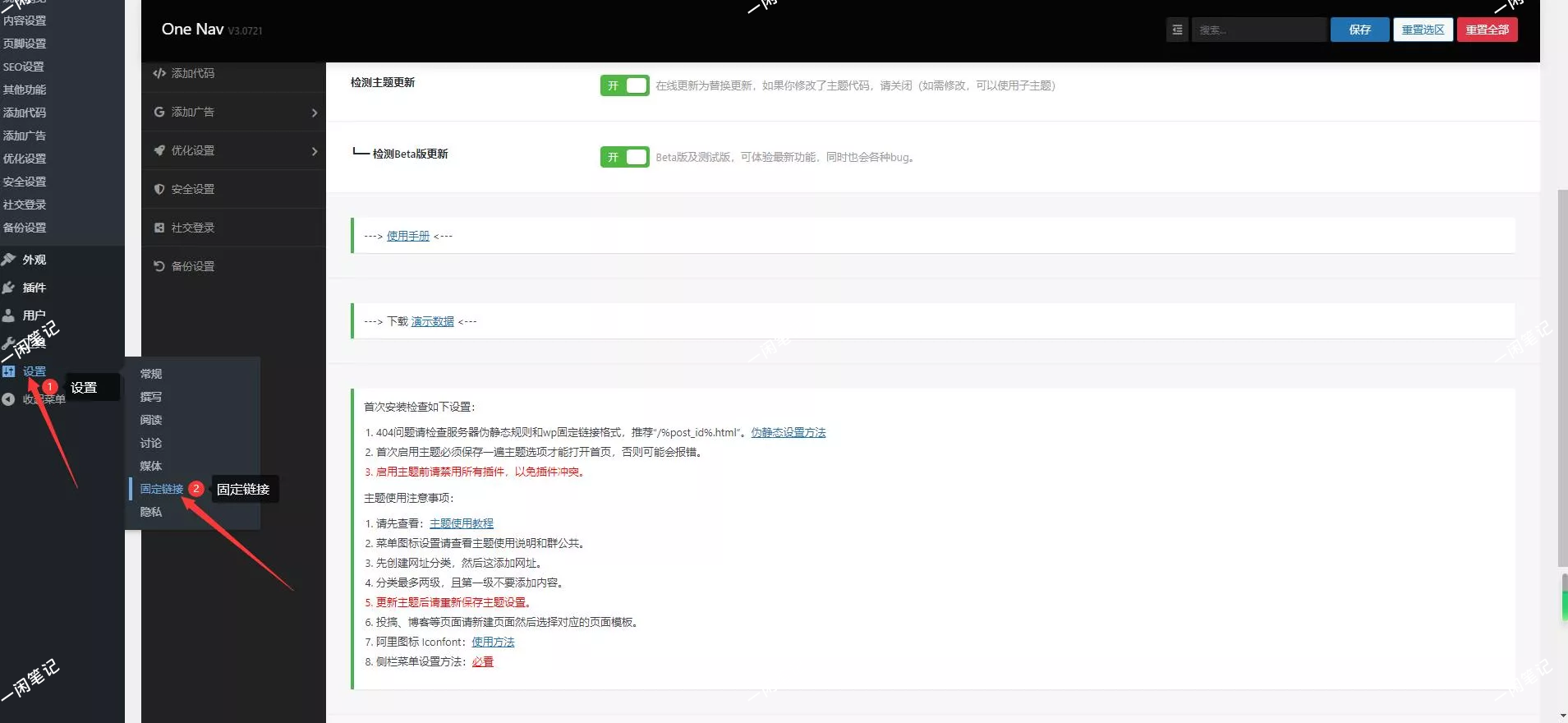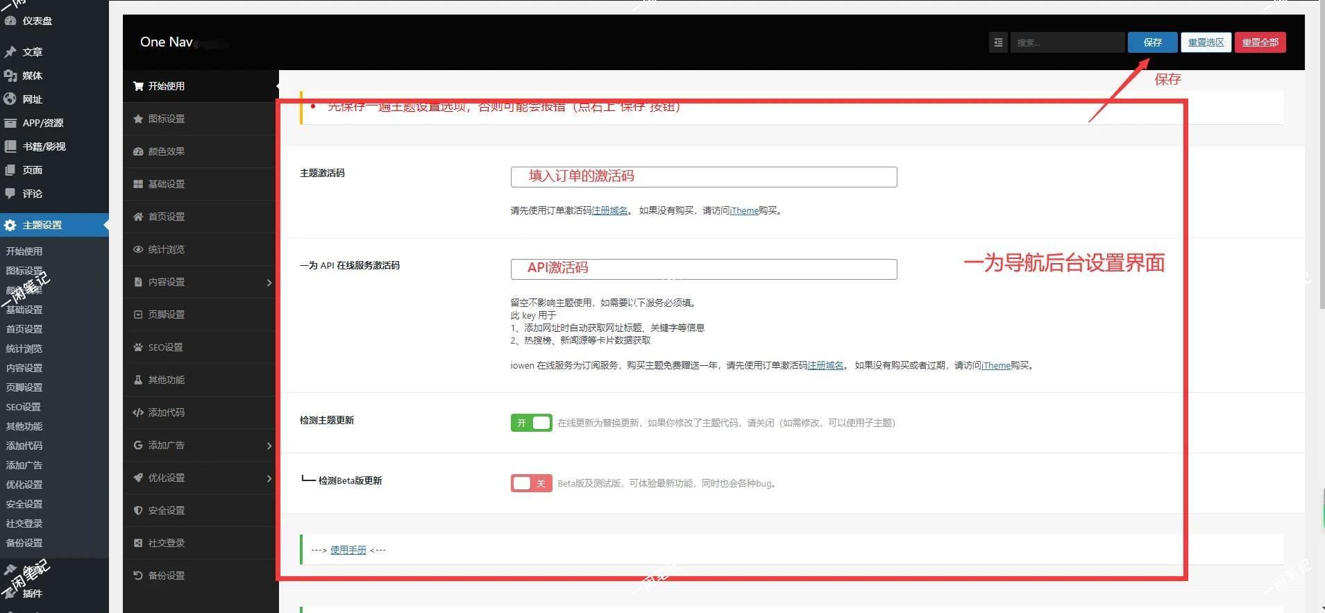 ⑧在One Nav后台填入一为主题订单的主题激活码,API激活码可不填。记得保存,保存有两个,右上方一个,右下方一个。