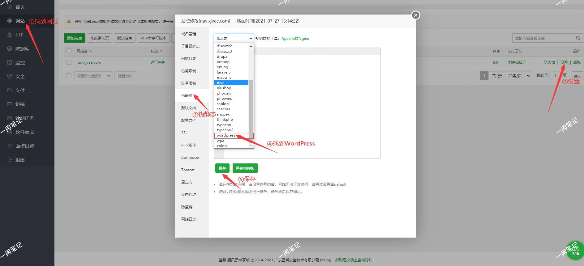 ①设置伪静态。进入宝塔面板,找到网站,设置,伪静态,找到WordPress,保存。