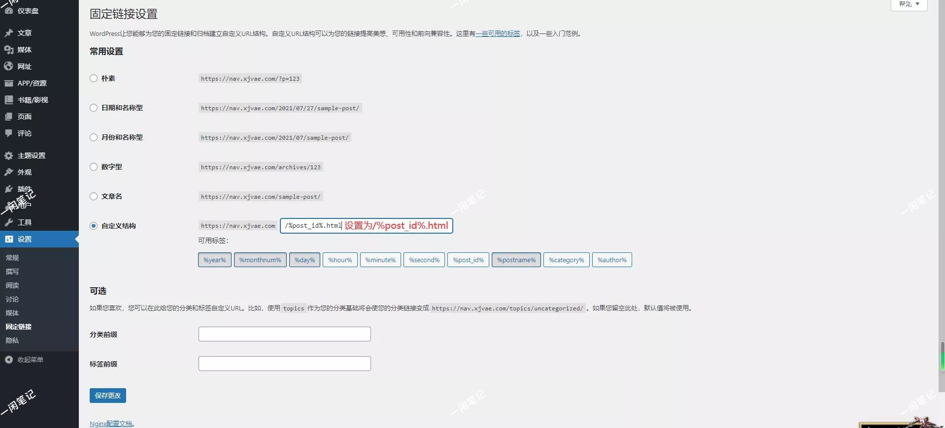 ②设置固定链接。回到WP后台,找到设置,固定链接,将固定链接设置为“/%post_id%.html”。