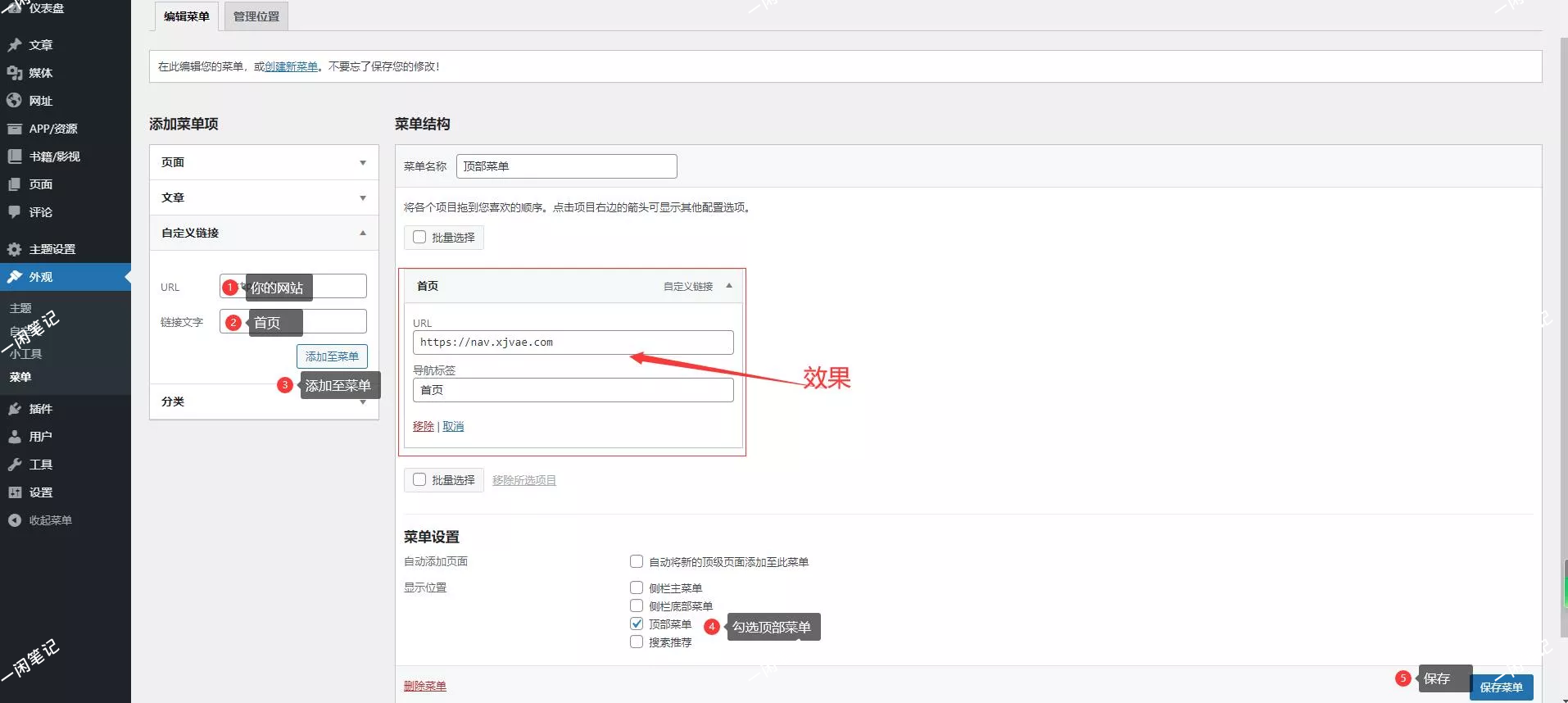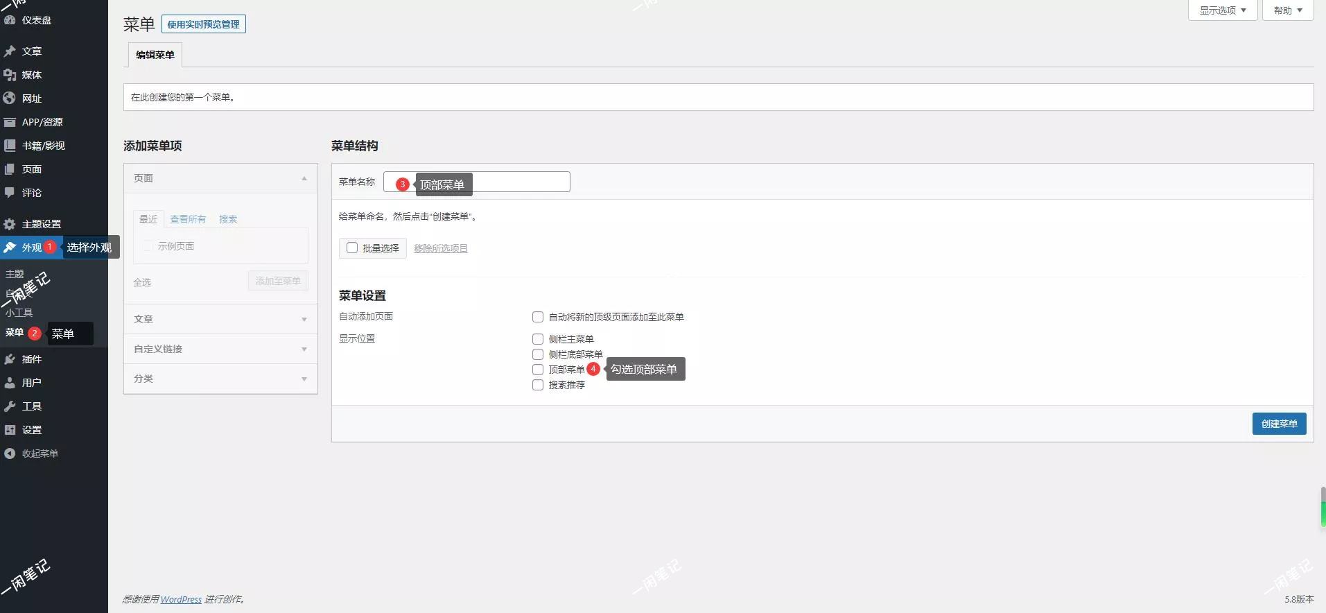 ③找到外观菜单,菜单名称输入顶部菜单,勾选顶部菜单,创建菜单。