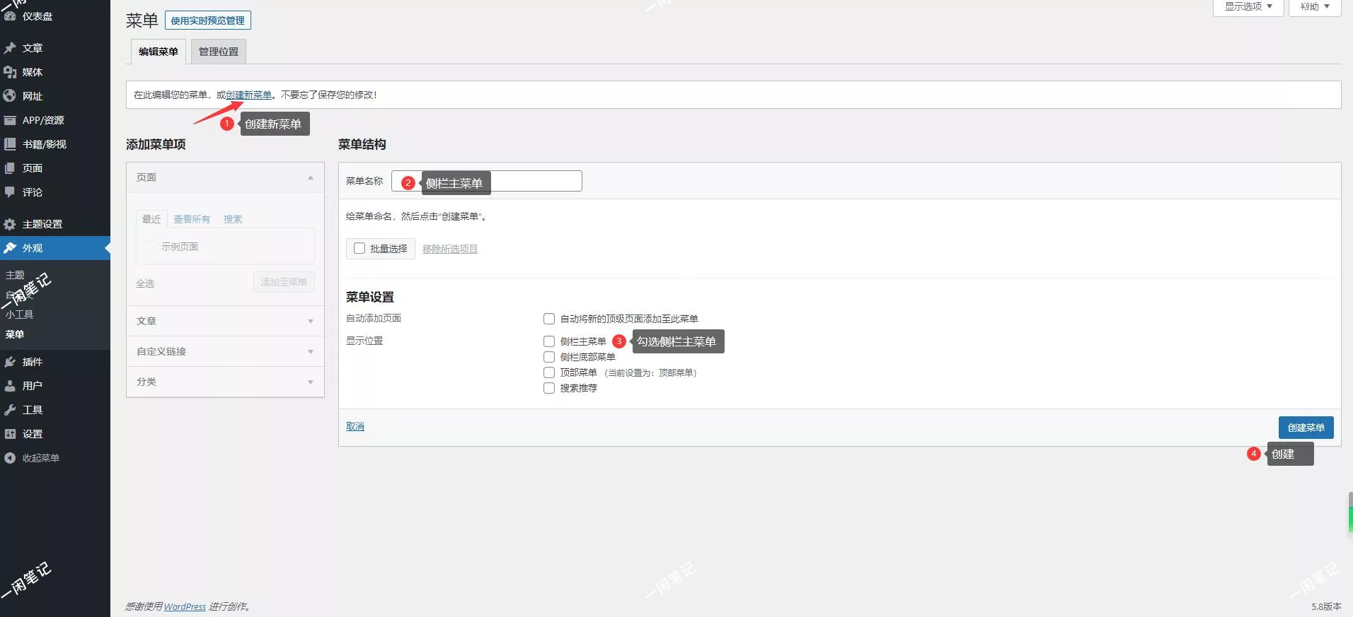 ④回到外观,创建新菜单,填入侧栏主菜单,勾选侧栏主菜单,创建。