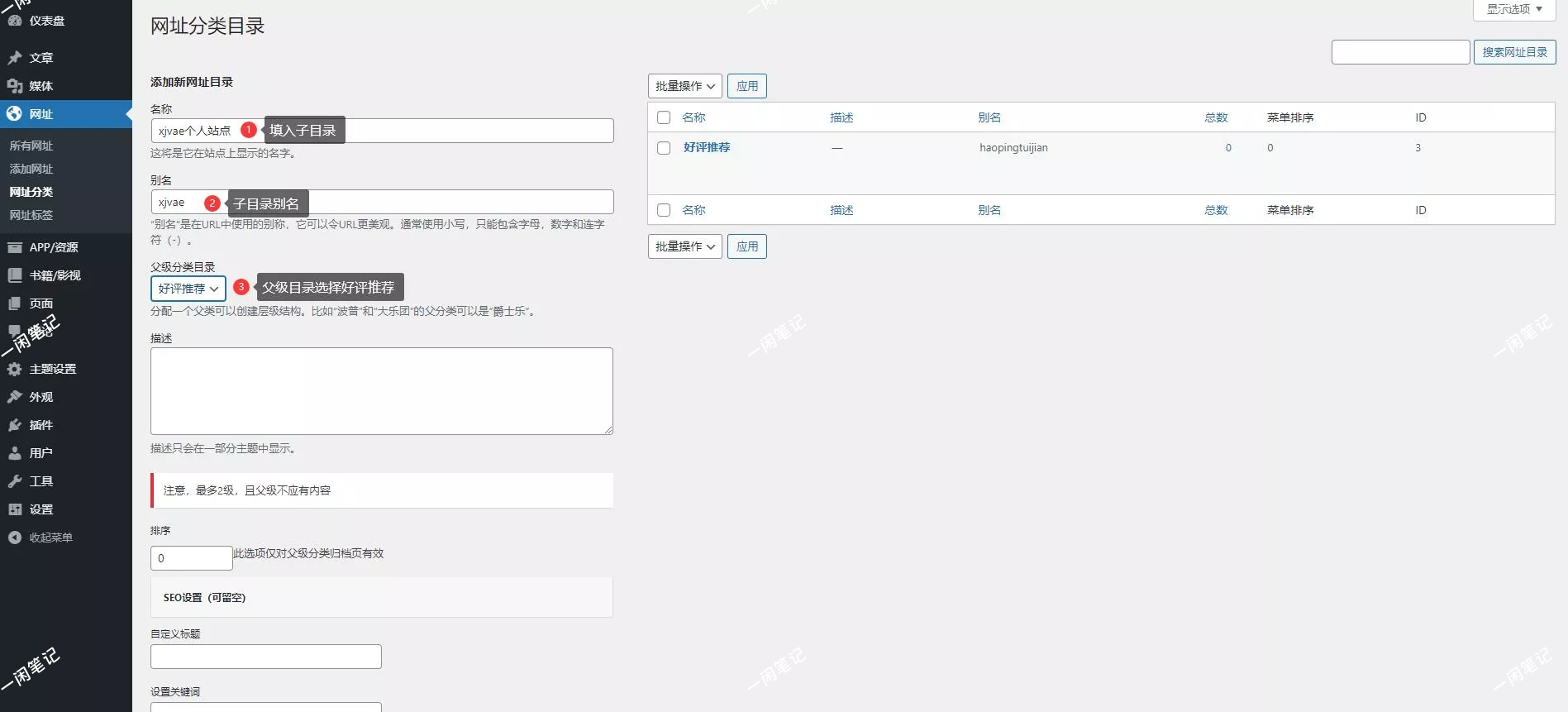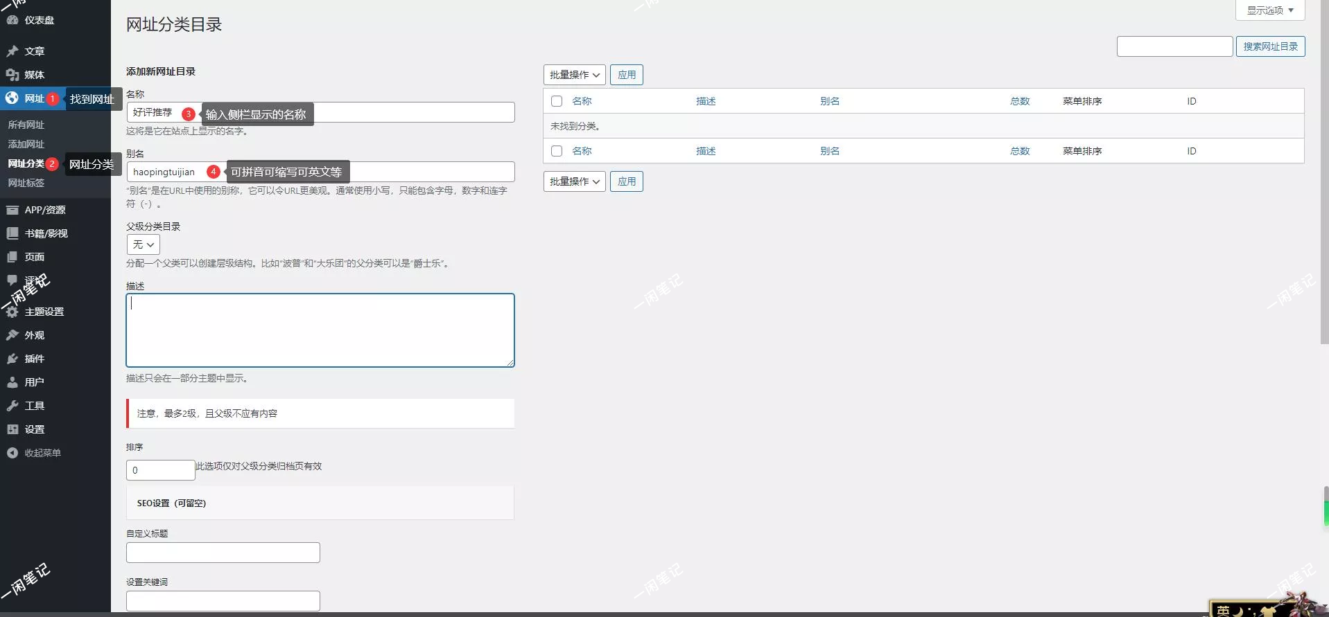 ⑤找到网址分类,添加个父级目录,比如好评推荐,别名:haopingtuijian,添加到新网址目录。