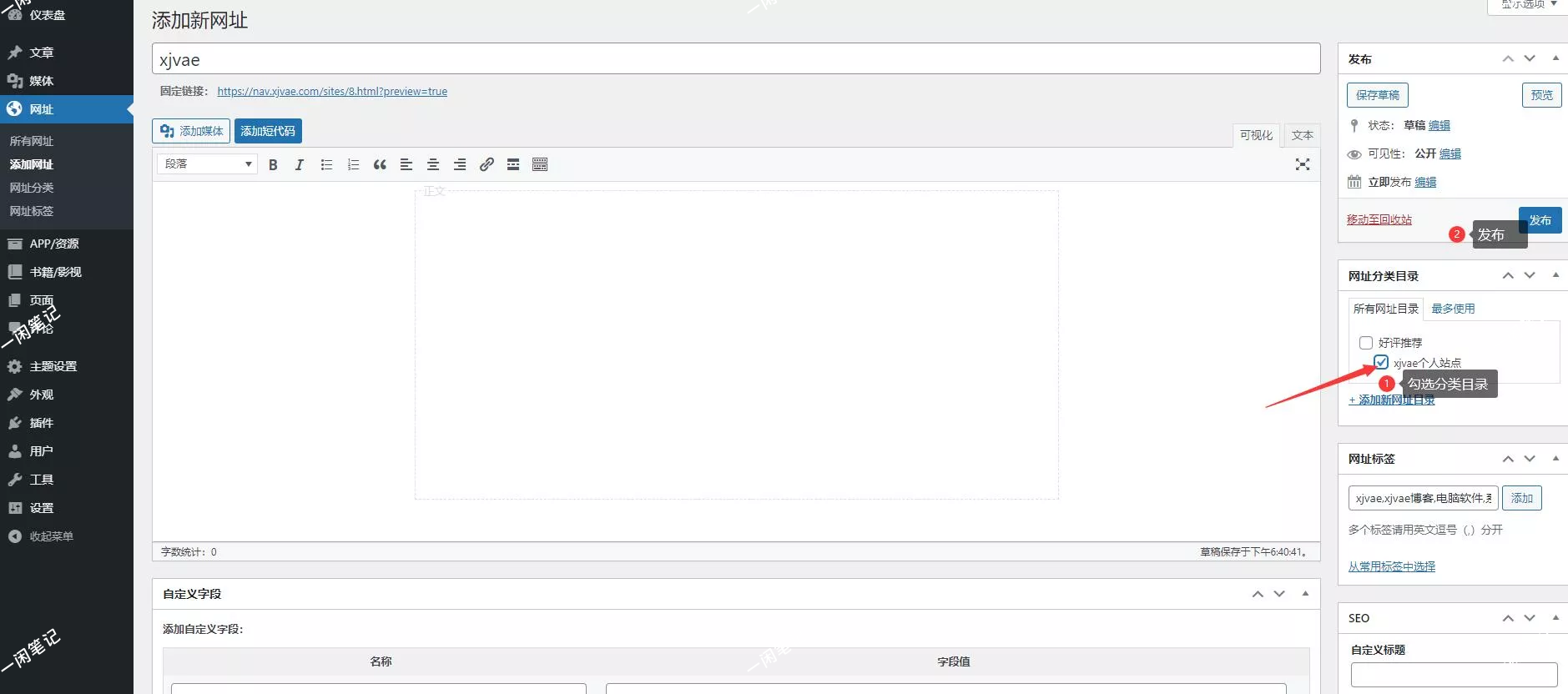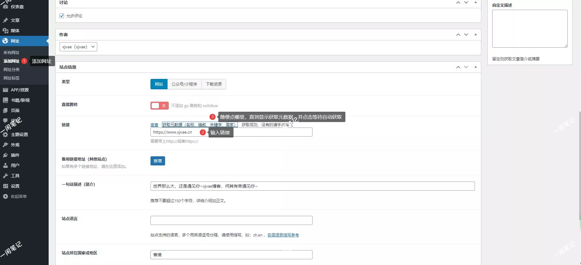 ⑦添加网址:鼠标滑到链接出,输入链接(必须带上http://或https://),空白地方随便点哪里,直到显示获取元数据(标题,简介,服务器位置,关键字,logo等都能获取到,偶尔可能会失灵,取决于对方服务器和logo格式),选择网址的分类目录,并发布。