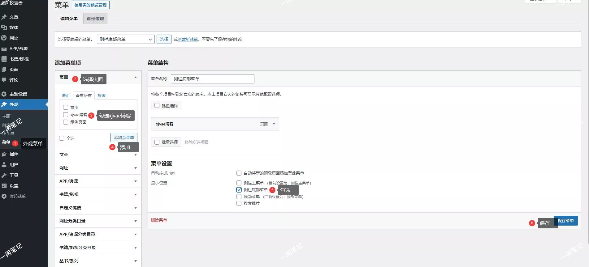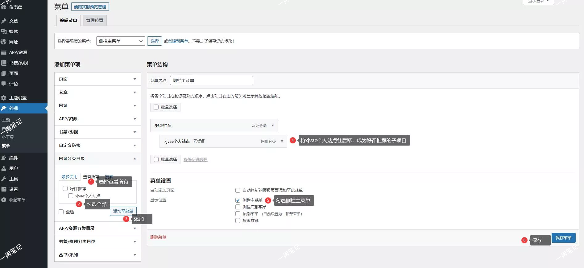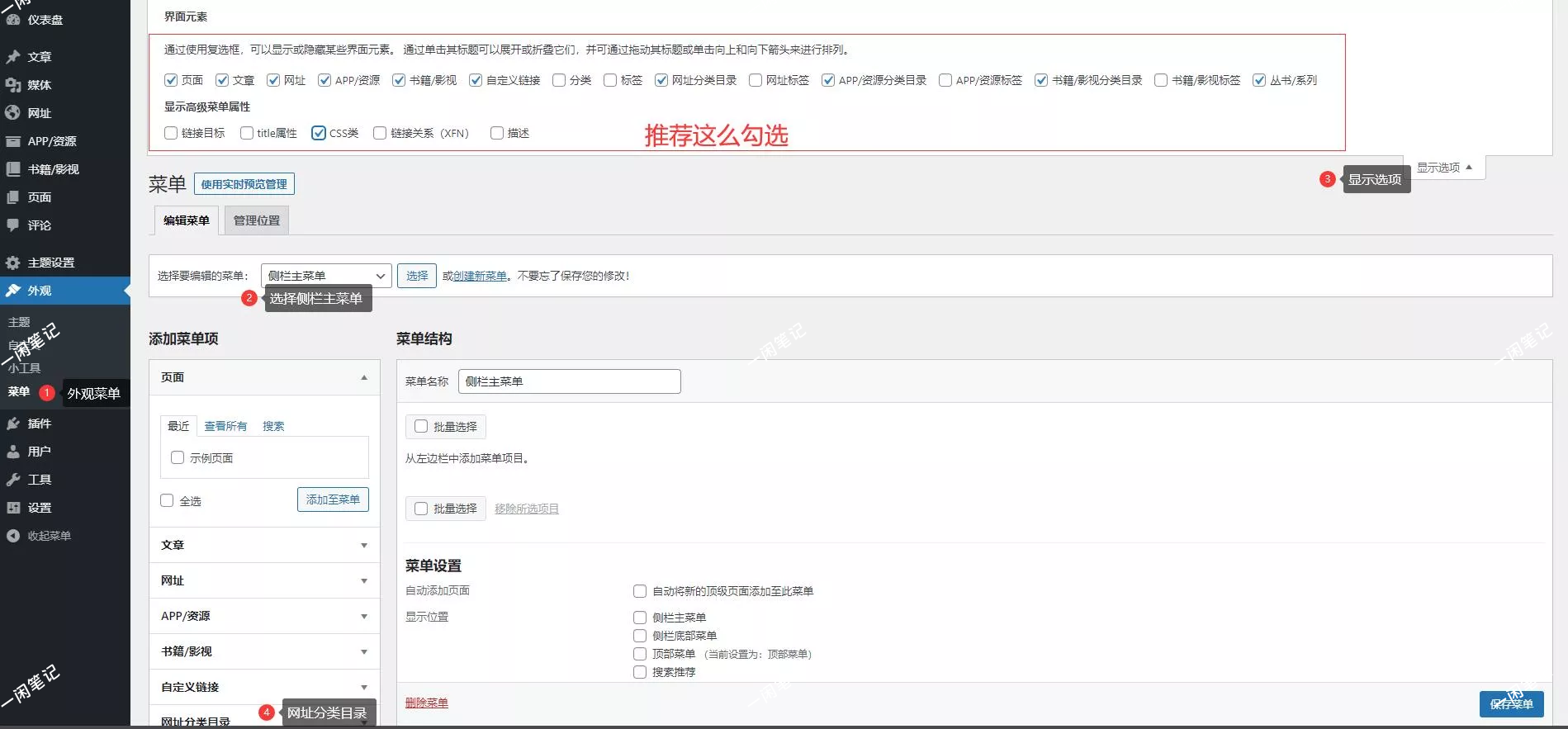 ⑧回到外观菜单,选择要编辑的侧栏主菜单,右上角点开显示选项,推荐勾选页面,文章,网址,APP/资源,书籍/影视,自定义链接,网址分类目录,APP/资源分类目录,书籍/影视分类目录,丛书/系列。显示高级属性CSS类。添加菜单项里面选择网址分类目录,查看所有,勾选全部到侧栏主菜单。将xjvae个人站点往后移,成为好评推荐的子项目,勾选侧栏主菜单并保存。